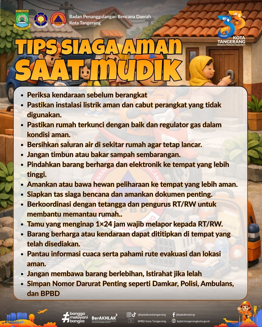 Kepala BPBD Kota Tangerang menekankan pentingnya kewaspadaan dini untuk mencegah potensi bahaya seperti kebakaran, pencurian, hingga dampak cuaca ekstrem. Berikut adalah panduan Tips Siaga Aman Saat Mudik yang perlu diperhatikan oleh masyarakat: