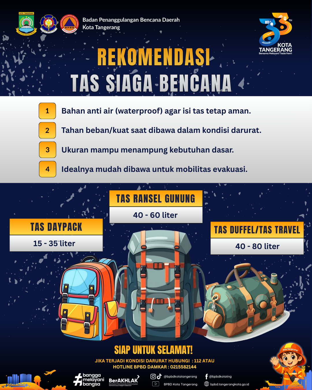 Berdasarkan panduan standar keselamatan, BPBD Kota Tangerang merilis daftar barang esensial yang wajib ada di dalam satu tas (disarankan model ransel) yang kedap air: